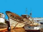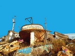 Scheepswrakken op een scheepskerkhof dichtbij Olhão, een slaperig havenstadje in de oost Algarve van Portugal. Deze verlaten plaats is van surrealistische schoonheid met de vele roestkleuren en de bizarre vormen van schroot en wrakken.